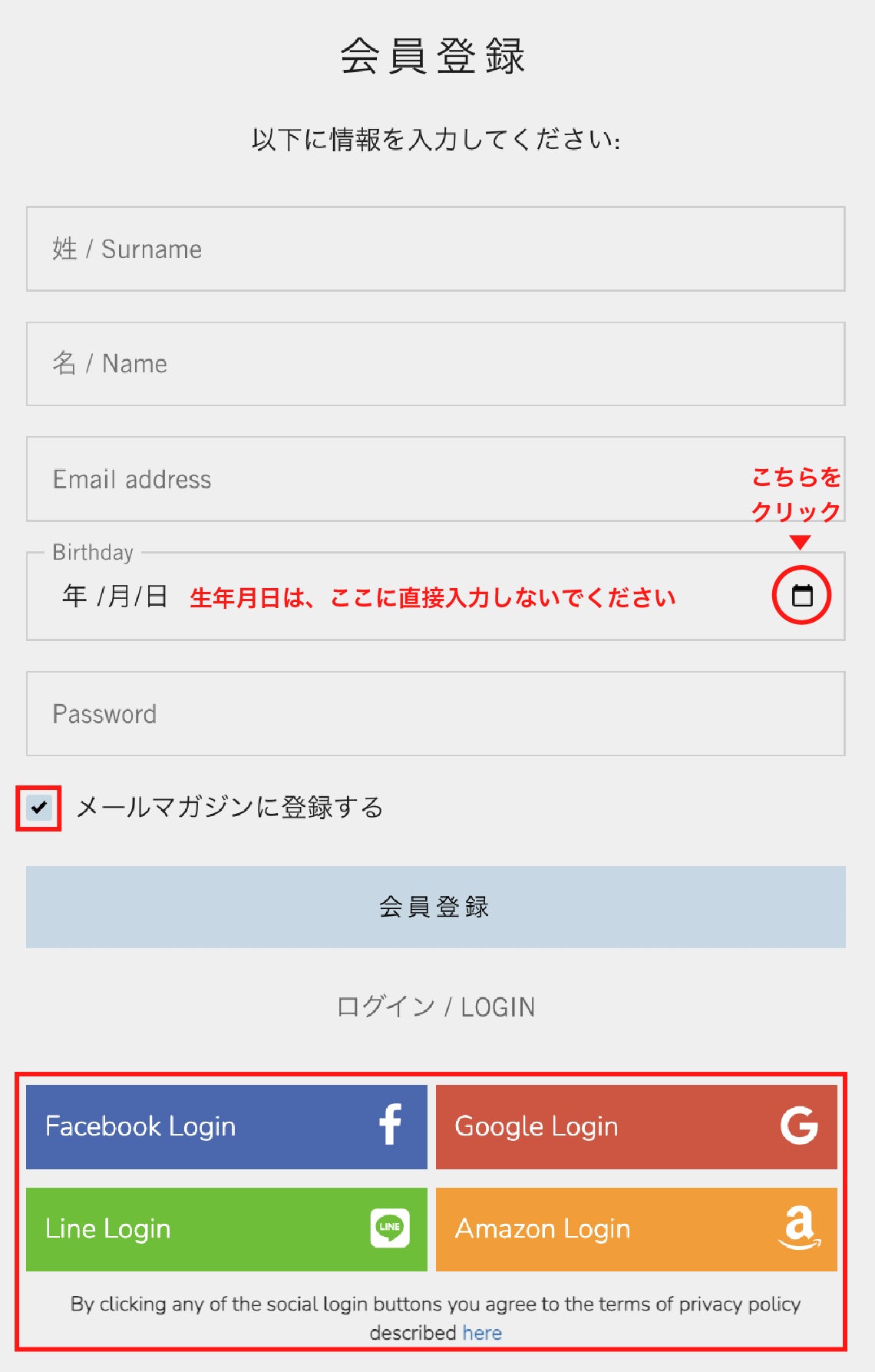 ⚫︎ 下の4つのソーシャルログインよりログインを行うとBirthdayのご入力ができない仕様のため、BIRTHDAY COUPONメールは届きません。